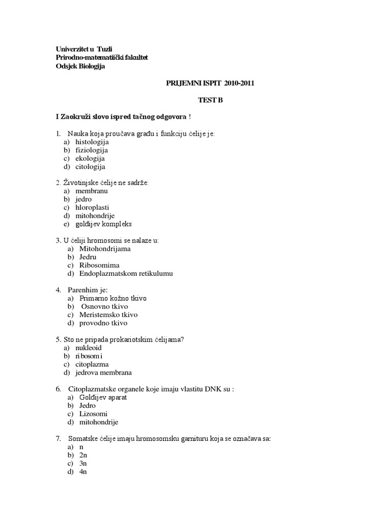 Primjeri Pitanja Za Prijemni Ispit Biologija