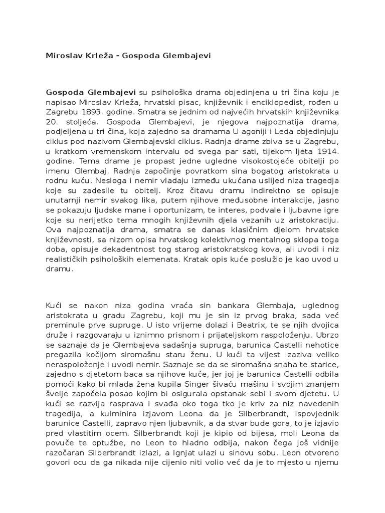 Esej M Krleza Gospoda Glembajevi Pdf Document