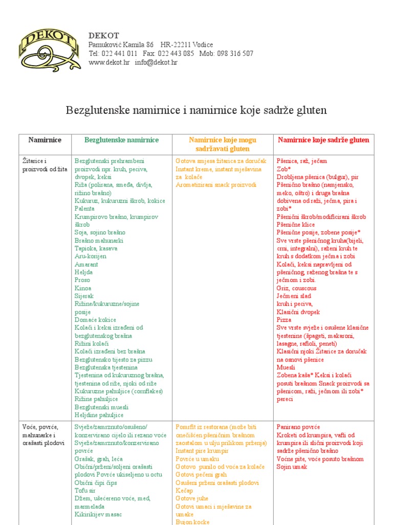 Bezglutenske Namirnice I Namirnice Koje Sadrze Gluten Dekot