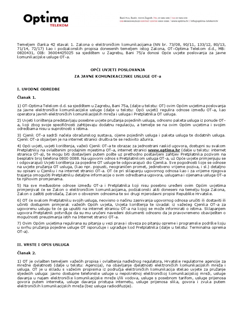 Opci Uvjeti Poslovanja Za Javne Komunikacijske Usluge Ot A