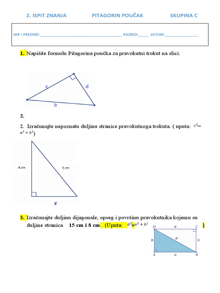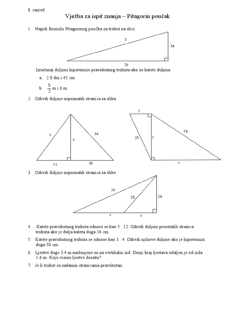 Zadatci Za Ponavljanje Cjeline Pitagorin Poucak 8 A