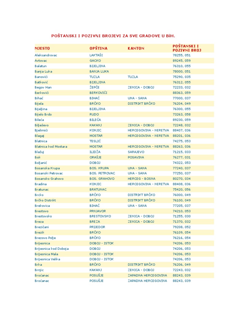 Postanski I Pozivni Brojevi Za Sve Gradove U Bih
