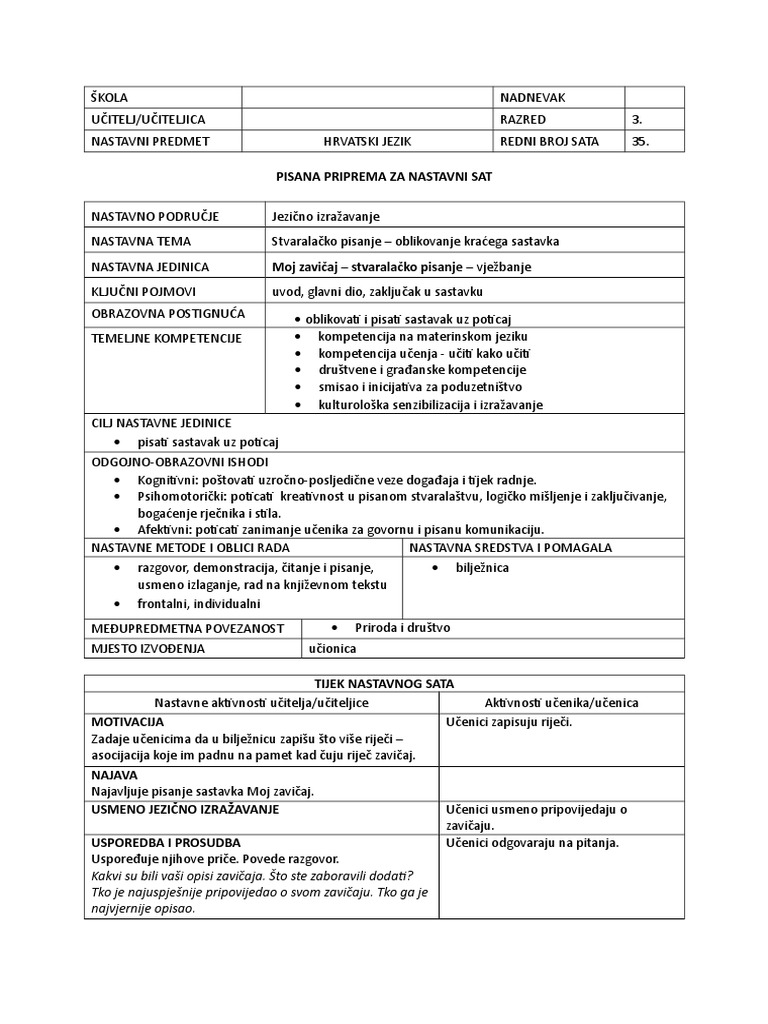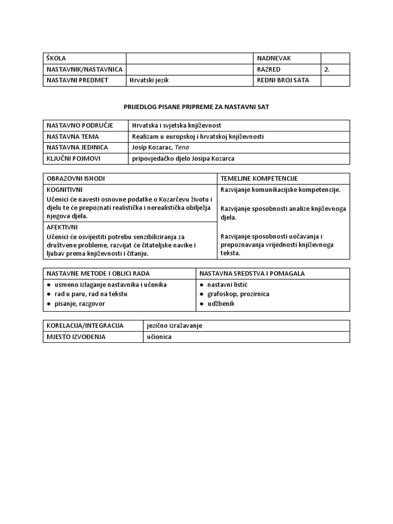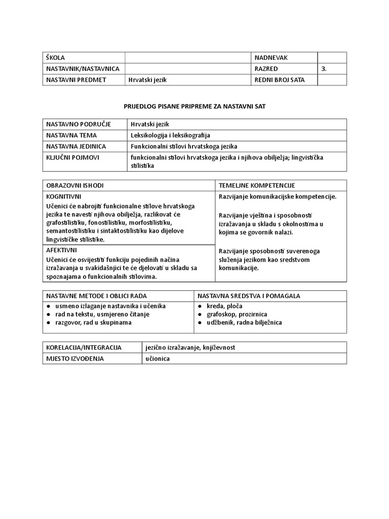 Priprema Za Nastavni Sat Hrvatskog Jezika